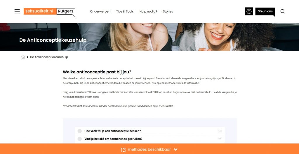 De anticonceptiekeuzehulp is een instrument van Expertisecentrum Rutgers dat helpt te ontdekken welke anticonceptie het meest bij iemand past. Daarvoor beantwoordt wie het betreft de vragen die voor hem/haar belangrijk zijn. Onderaan in de oranje balk verschijnen de anticonceptiemethoden die passen bij diens wensen.