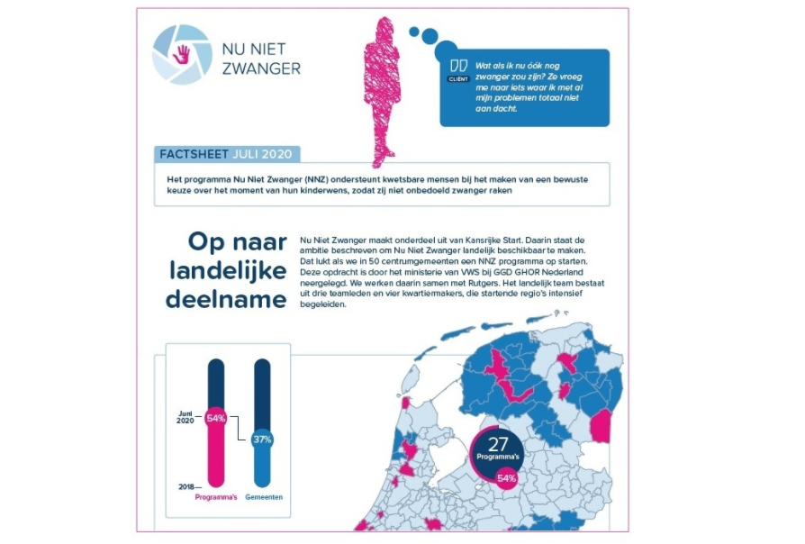 Midden 2020 en we zijn alweer 2,5 jaar onderweg met de landelijke uitrol van Nu Niet Zwanger. Het programma verspreidt zich als een olievlek over het land en is inmiddels in meer dan 1 op 3 van de gemeenten actief. Met trots presenteren we de tussentijdse resultaten gebundeld in een factsheet.